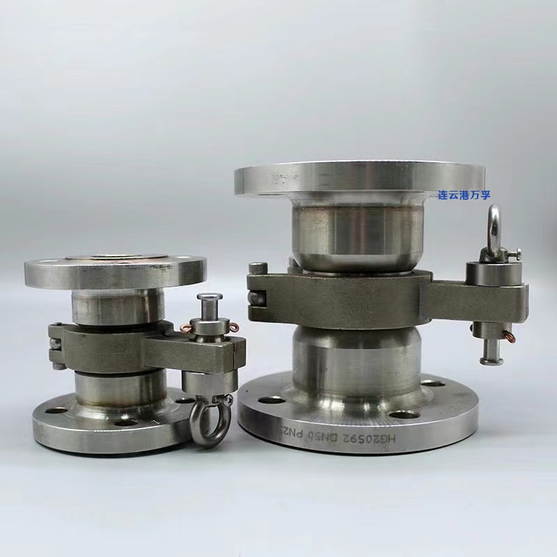 鋼絲繩牽引式拉斷閥用來保障槽罐車、鐵路河運之間物料裝卸安全。機械原理:設(shè)置一根鋼絲繩,沿著軟管或者鶴管裝在車移動方向,一端系在拉斷閥上,另一端固定在鶴管立柱 內(nèi)臂 或者其周邊固定附屬物上。鋼絲繩的極限伸展長度一定要比軟管或者鶴管內(nèi)臂加外臂的長度短,從而在槽車意外移動時,保證鋼絲繩提前繃緊。在流體管路受力前觸發(fā)拉斷閥,拉斷閥分離成兩部分,分離截面瞬間關(guān)閉,避免事故發(fā)生。